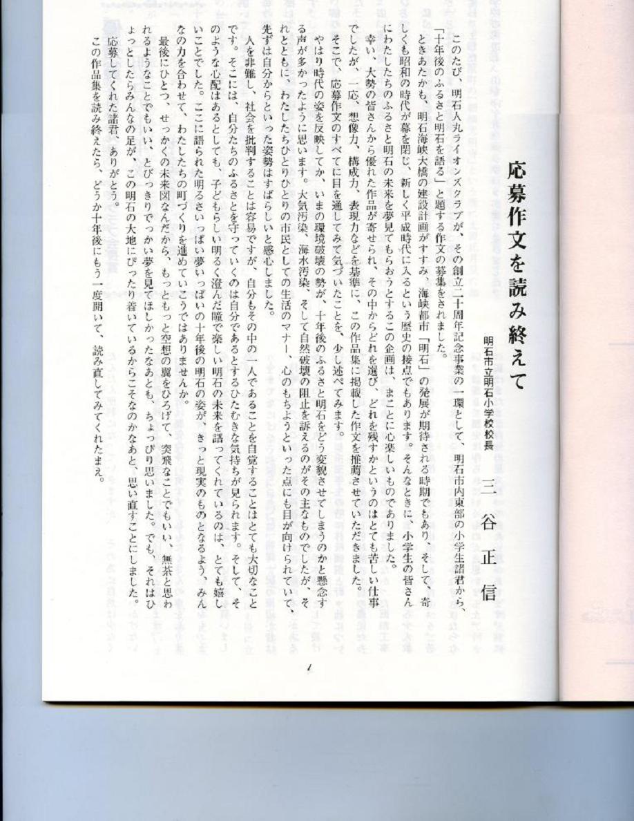 そこで考え付いたのがまず明石海峡大橋が完成する10年後の明石はどうなっているのか、小学5・6年生を対象に作文を募集し、厚かましいことながら優秀作品を選び作文集を作ることだった。題して『10年後のふるさと明石を語る』。