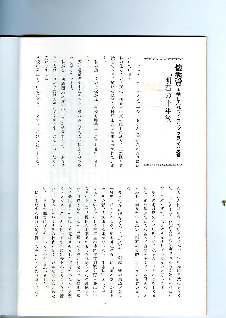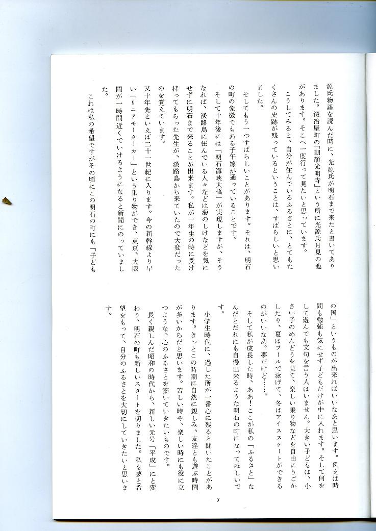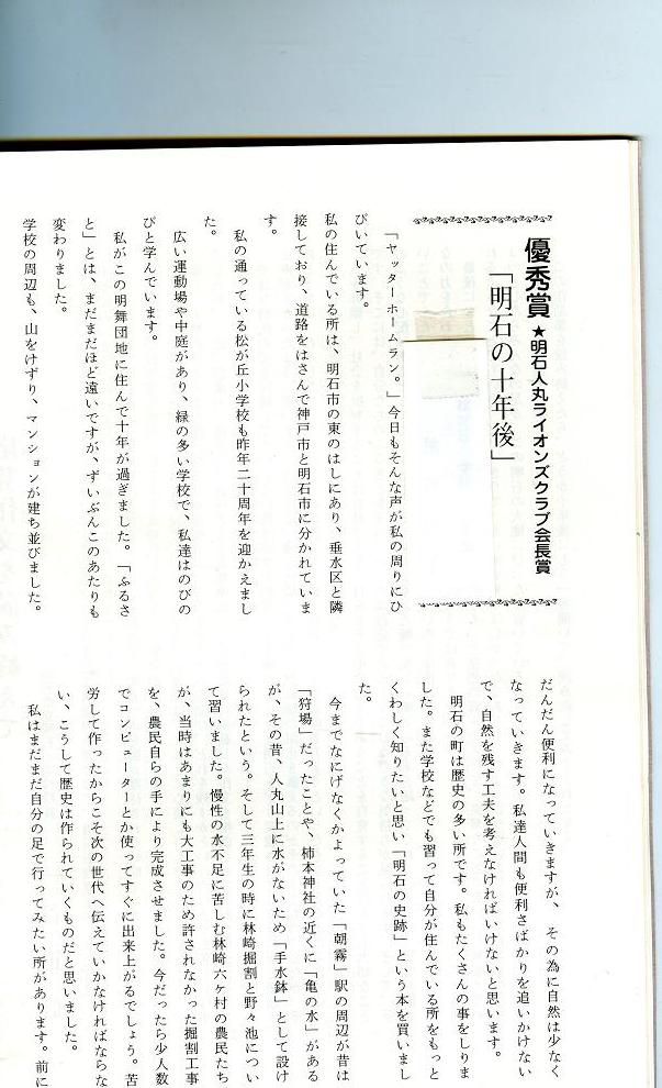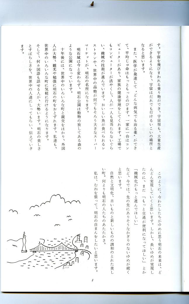 出来あがったのは70ページほどの小冊子であったが、そのもう一つの目的は10年後、明石海峡大橋がかかる頃。この子たちが、大学を卒業して社会人になる頃、もう一度読み返してくれたなら、どんな感想を持つだろうかということだった。