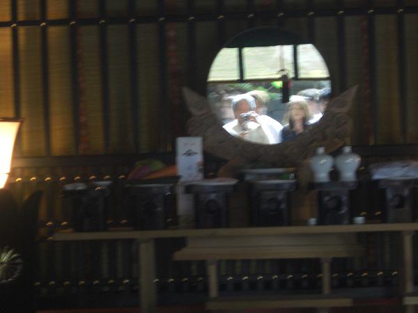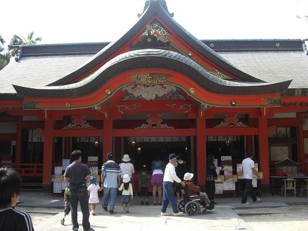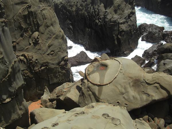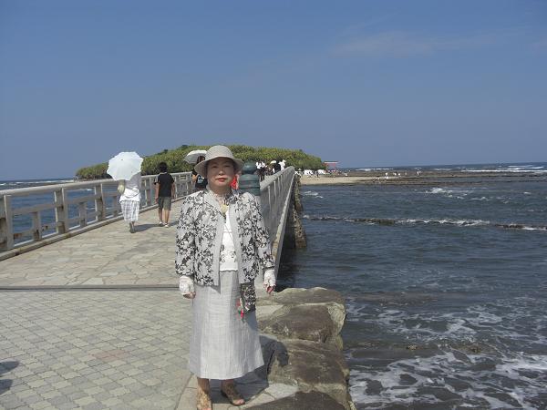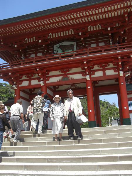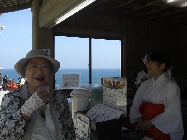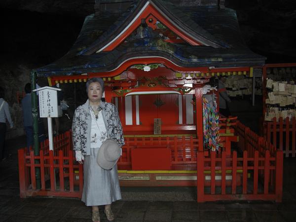 どこまでも青い太平洋が眼前に広がり、断崖絶壁を伝って下った左に大きな洞窟があり、その中に神社は鎮座されている。この洞窟は約300坪はあろうかという広いもので、続々と続く人波に押されて正面に運ばれ十いった感じ。一瞬御神鏡に我が顔が映った様な気がしてシャッターを切る。弘子ちゃん曰く、そんなことをしているのはあんただけよとノタマウ。この神社の御神徳は縁結び、安産、育児、海上安全となっているからには、孫授かりのお願いと、3人の孫ちゃんのお守りを頂かないと。