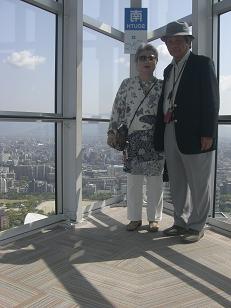 地上123メートルにある最上階の展望室からは、福岡の町並み、博多湾、背振山系と360度のパノラマが楽しめます。また運よく青空に恵まれ日差しが熱いぐらい。