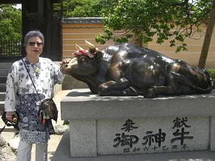 お参りを終え、神牛をさすり、孫たちに学業守りを買った。