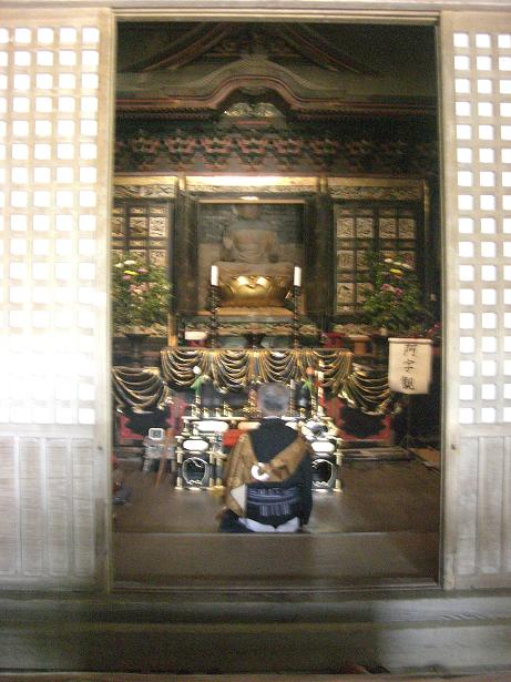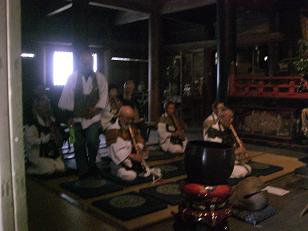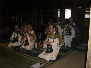 本堂(金堂)をお参りするため上ると、中から尺八の演奏が聞こえてきた。お寺で尺八とは何事とあたりを見回すと増位山虚無僧保存会・虚無僧供養献奏大会の張り紙。えもいわれぬ音色に魅かれて堂内を除くと、住職らしきお方が中で聞きなさいと手招きして下さる。