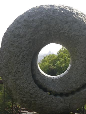 参道ドライブウエーを下る途中にある、見晴らし台に設えられた石のオブジェ(写真)の中空を覗くと、姫路城がスッポリ入って見える。お城の後背として重要な位置にある自然の要害であれば、城主もこれを守り本尊とたよったことは間違いない。