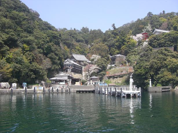 竹生島へは25分の航海。意外と近い。湖岸から見る島は北面ばかりで、なんの変哲もない小島だが、着岸する南面は島一体が寺と神社の境内となっています。