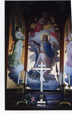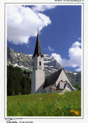 あくまでも青いアルプスの空を背景にした教会の写真はSCHROCKENを出発して最初の街らしい街NESSLEGGでのもの。