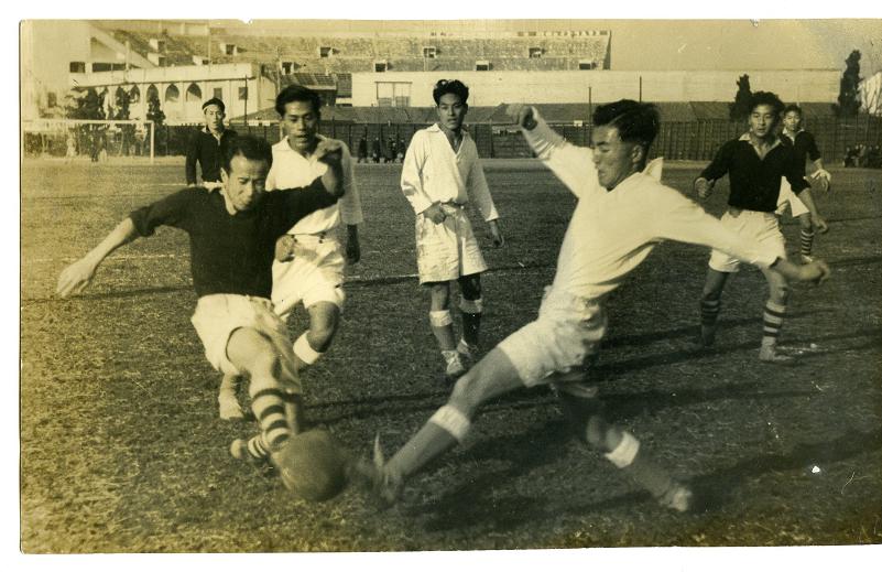 後ろに見えるスタジアムは西宮球場です。この試合対早稲田戦は3-2で神戸商大の勝利となった伝説の一戦。(昭和26年1月26日東西対抗)