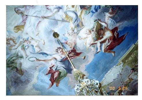 宮殿内は肖像を主に絵画で飾られ、天井絵はキリスト礼賛の絵巻で埋め尽くされている。