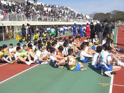 ここ3-4日雨ふりが続いていたのが嘘のように、青空が広がった2月28日(土)。明石公園の陸上競技場周辺は、早朝から第23回小学生駅伝大会の参加者と父兄・応援団で賑わっておりました。