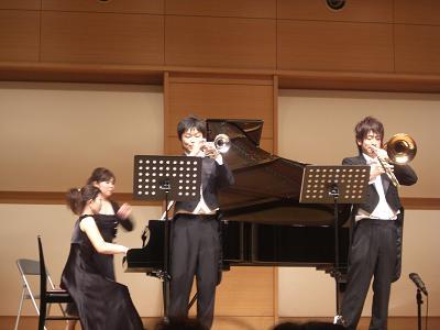 駅伝大会の打ち上げが3時からあり、それに引き続いてアスピア・明石市生涯学習センター9Fホールで、表記のコンサートに駆けつける。岡村君は23歳、大久保北中、明石南高校と過ごしたトロンボーン奏者。恩師である山口博之教諭・トロンボーンの影響を受けソリストを目指している一方西馬君は1歳年上で神出中、明石北高校と過ごしたトランペッターだそうな。