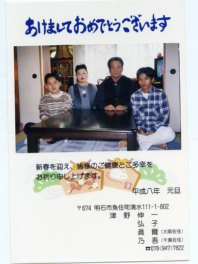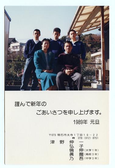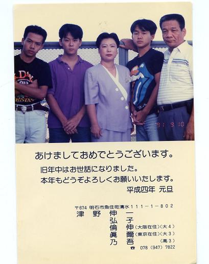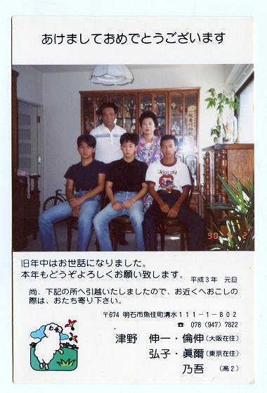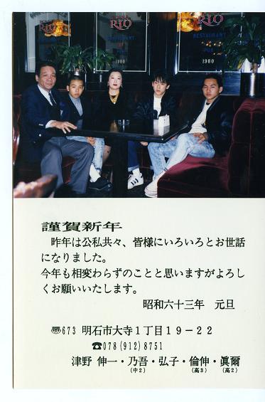 平成2年の賀状につかっているのは前年の夏、ライオンズクラブのYE(YOUTH EXCHANGE)事業のホストファミリーを引きうけた際のロビンの送別会風景の一場面。状勢としては交換学生を40日間も受け入れる余裕などあるわけがない中、長男が1986(昭和61年)6月に先行してネブラスカに40日間交換学生としてお世話になっていた御返しとして、どうしても受け入れなければならなかった。みての通り、私が望んでいたプリテイなガールとは違って、でっかいお尻の男の子みたいなロビンはある意味気を使わずに付き合え、それはそれでよかったんだ。この40日の間、弘子ちゃんはつきっきりで世話を焼いた。明石市長への表敬訪問から、盆踊りの着物の用意まで。伊丹へ見送りにゆくころは本当別れがたいほど、お互いに気持が通じていた。