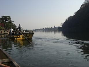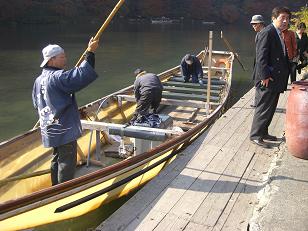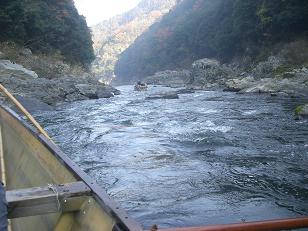 こちらも負けずに、下った後船頭さんはどうして船着場に戻ってくるのかと質問。嵐山渡月橋あたりで川船3隻を乗せたトラックは見かけるが、さて船頭さんはどうするのか知りたかった。JRで亀岡駅まで帰りますとの返事。120名の船頭さんが毎日でているとか。船会社と船頭さんで船賃を応分にわけることまで聞きだした。