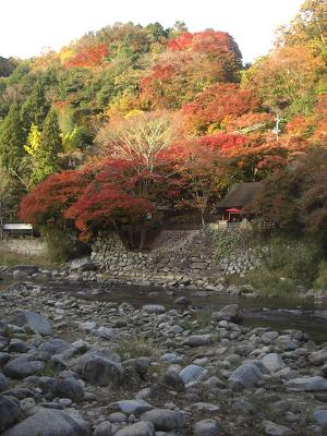 昨夜のライトアップは、ほんと真っ暗闇のなか、どう歩いたのかよくは分からなかったが、一応足助屋敷から西の入口までの地理は頭に入っている。もう朝日が対岸の山々を照らす。山影になって、モミジがおひさまに照らされるのは、お昼をすぎてからになりそう。と思って足助屋敷の奥を見ると、そこはドッグレッグしていて、朝日に照り輝く紅葉が見える。一の谷という一角だ。