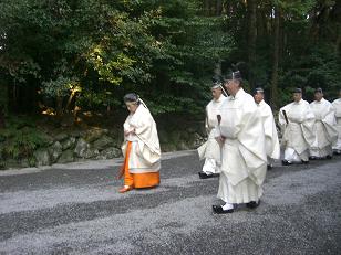 本宮へと急ぐ途中、突然人並みが途切れて、斎服の一団が一列になって、静静と進んでくるのに遭遇した。