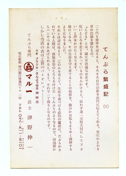 丁度5ヶ月後の3月17日、ビル落成と同時に、てんぷらマル一を開店した。このマル一は津野の家紋・渡辺星の略紋を言います。明石の地に津野の旗を立てる気概を示したかったんだ。しかしお店はどう見ても和風喫茶風にできあがっておりました。