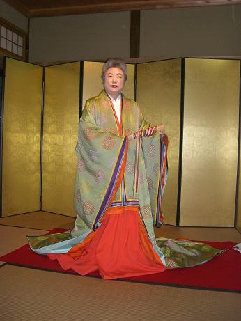 紫式部が源氏物語を書くにあたって、石山寺の一室に七日間篭ってその構想を練ったとされている。入山料と展示場入場券がセットでお得といわれれば、そうするのが人情。お山に入る前に長々と源氏物語に付き合いさせられることになった。田辺聖子氏の源氏が展示してあり、最近は神戸新聞・明石版に「源氏物語」明石の巻を読むと題して京都橘大名誉教授・鈴木紀子さんのエッセイで忍従の人・明石の君を拝読しておりましたので13帖あたりを丹念に呼んでおりましたら、弘子ちゃんが十二単を纏ってみるといいだした。(写真・左)