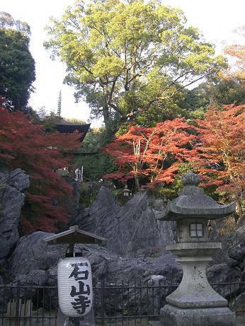 やっと展示場を抜けだして、参道の階段を登りつめた境内に広がる石山の威容は、おりから射す日光に照らされて輝く紅葉の彩りと相まって、思わず感嘆の声を漏らすほど。本堂は国指定天然記念物の珪灰岩(石山寺珪灰岩)という巨大な岩盤の上に立っている。瀬田川の右岸に位置し琵琶湖からの流水が音を立てて流れる。