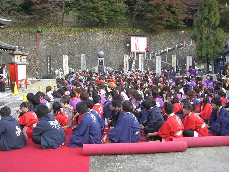 あくる15日。早朝から西国三十三ヶ所の京都市内五ヶ所と亀岡の穴太寺での納経の後、2:30には高台寺駐車場に到着。しかし高台寺・霊山・清水あたりは折からの秘仏御開帳と紅葉と相まって人波でごった返している。駐車場に入れるのに1時間もかかった。急いで霊山神社の境内に駆け付ける。今年から始まった「龍馬よさこい」の真っ最中。総勢300人の学生連が参加してのよさこい奉納だ。この眺めはなかなかのもので、霊山に良く似合っている。これは続くと直感する。恒例の北川村提供のしゃも汁を頂いて、龍馬さん・慎太郎さんの無念を偲ぶ。去年4月に龍馬検定・神戸編実施成功の報告も出来た。