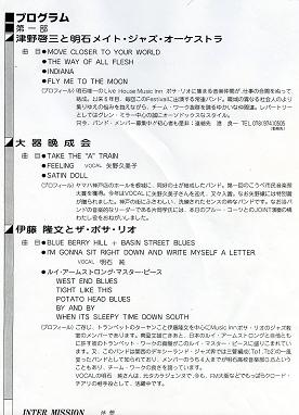当日のプログラムにそれぞれのバンドのプロフィールがあります。その演奏曲目もそれぞれの実力に合った、お客様を喜ばせるに足る、良い選曲だと感心させられる。大器晩成会は片岡学氏の指導を得て、この当時売り出し、伸び盛りでありました。明石メイトも啓三と港良一の両輪を得て立派に成長。我がボサリオも今考えると、伊藤隆文の最後の煌めきを見せたステージとなりました。