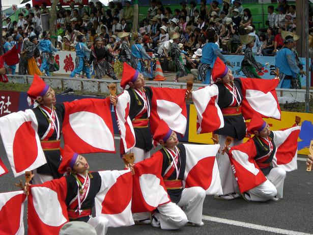 それが、北海道・札幌でソーランよさこいが始まった頃から、音曲は大音量のPAとスピーカーを装備して、なおかつ一場の舞台と見紛う設えをほどこした地方車へと変化し、踊り子はこれまた、工夫の限りをつくした、艶やかな衣装を纏い、強烈なロックのリズムにのって踊り狂うように変化してまいりました。特に大漁旗にみたてた大旗を振りかざすのは、むしろソーランからの影響といえましょう。