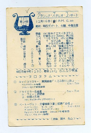 *この頃になると、かなり落ち着いてきております。サッカーのシーズンも終わり、明石高校OB吹奏楽団も北海道・室蘭の富士鉄体育館で行われた、第10回全日本吹奏楽コンクール一般の部で優勝を飾っている。小林主将の温情で、シーズン中に関わらず、一試合を抜けての全国コンクール出場を許された。このとき一般の部とはいいながら、現役混成が許されていて、弟啓三が明石高校2年でいたことから兄弟出演となりました。もちろん弘子ちゃんは3年で一緒に、大阪発・夜行列車日本海でガタゴト揺られてまいりました。青函連絡船の大きさに歓声をあげたりして。