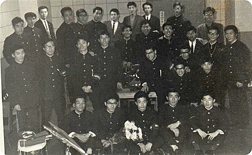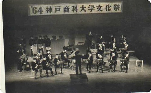 今まで書き綴り、書きなぐってきた文を再読すると、まるでサッカーしかやっていないような印象を与えかねない。しかし、実際は勉学に励み、読書に勤しみ、デートも欠かさず、ラッパもずっと吹いておりました。昭和37年の秋ごろか、同期の2回生の中の元気者7人ほどが、元気をもてあましてでもないだろうが、1.我が学園に独特なスクールカラーを打ち出す機会をつくること。1.体育会、文化会のより一層の発展。1.商大生同志間の融和。の3つをスローガンに応援団創団の動きを示した。準備段階として児島武・鯖田淳一・北林弘美・竹内茂・赤木克彦・岡田述史・萩原圭裕が7人のサムライと称して、まず陸声会を立ち上げた。グランドの隅で蛮声を上げている連中は、揃いも揃って、小柄で、恐ろしく足が短かったことを何故か妙によく覚えている。翌昭和38年2月1日を期して、サッカー部顧問であられた田中博教授を顧問に迎え、神戸商j科大学応援団が創団、発足した。当時応援団設立趣意書を各界OBに発したところ、予想以上の反響があり、多大な厚志を頂く結果となった。皆さん母校を思う熱い気持ちの結集であったのでしょう。特に力を入れられたのが、当時東京財界で勇名を馳せておられた高商2回生・野村證券中興の祖と謳われた北裏喜一郎社長であったとか。